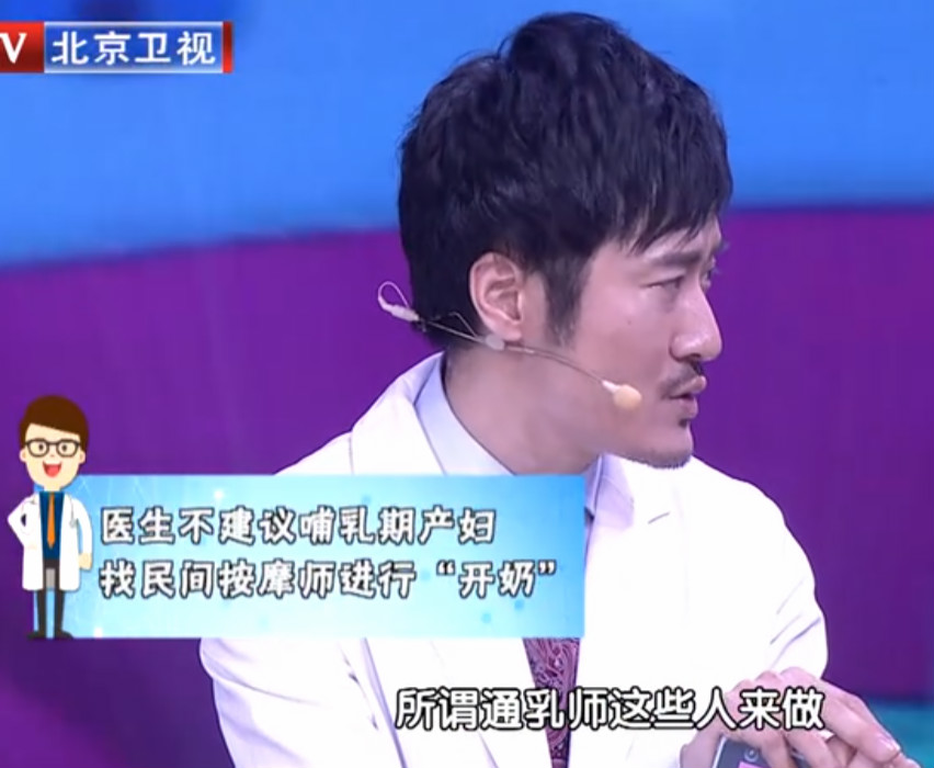 昨晚北京卫视播出最新一期《我是大医生》栏目,这期的话题是乳腺癌你必须知道事实。其中提到盲目按摩伤害乳腺健康,嘉宾主持首都医科大学附属北京友谊医院普外科、北京肿瘤医院国际诊疗中心乳腺外科王子函副主任医师就此提出不建议哺乳期产妇找民间按摩师(所谓通乳师)进行“开奶”,而是应该找国际认证的母乳顾问。