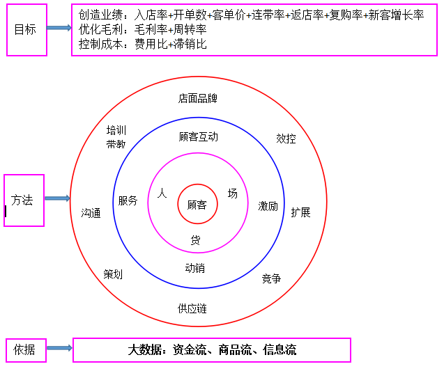 店面业绩目标包括入店率+开单数+客单价+连带率+返店率+复购率+新客增长率;入店率的高与低取决于店面商品及店面口碑对于消费者的吸引度;通过货、场、人三要素的到位,保障店面销量的稳定,在良性销售的基础上,可以提升成交率来达成开单数的增加,通过商品、店与顾客之间的粘性,不断提升连带率带动客单价的提升;零售要创造健康的零售业绩,店面一定要有高的返店率与商品复购率,店面的生命力才真正健康,业绩才稳定,而想要创造更高业绩,更要拓展新顾客群体,吸纳更多的新生消费力量入店,业绩的持续增长才有保障。