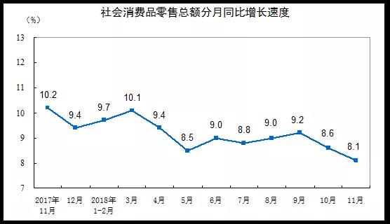 根据国家统计局数据显示,2018年11月份,全国社会消费品零售总额35260亿元,同比名义增长8.1%(扣除价格因素实际增长5.8%,以下除特殊说明外均为名义增长)。其中,限额以上单位消费品零售额13679亿元,增长2.1%。