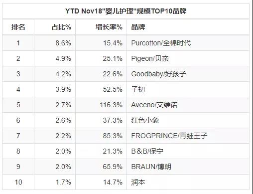 根据情报通数据显示,2018年婴儿护理TOP10品牌分别为全棉时代、贝亲、好孩子、子初、艾维诺、红色小象、青蛙王子、保宁、博朗、润本,且以上品牌在去年均呈增长态势,其中全棉时代以销售额88.7亿元,市场占比8.6%的成绩远跑在市场前列,而艾维诺的增幅则位列TOP10榜首,达116.3%。