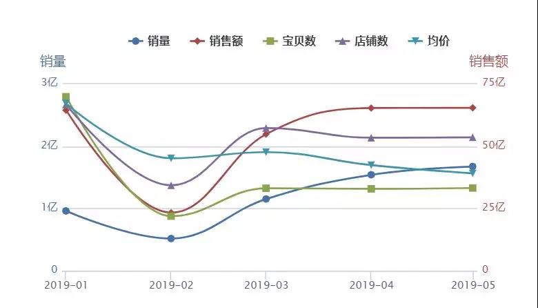 从天猫+淘宝,童装的线上数据来看,2019年1月~5月,除2月份之外,其他月份的销售额相差不多。产品平均单价在5月份最低,不到40元,但是销售额却比其他月份略高。2月份受春节影响,销量、销售额都下降。童装的销售有季节的区分,但是总体来看不是很明显。