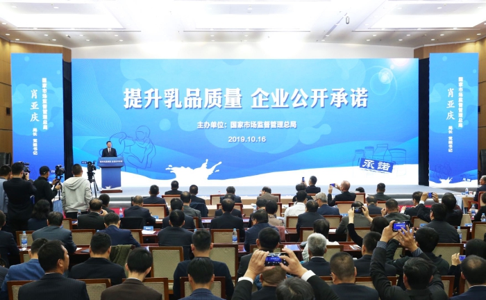 10月16日,市场监管总局在京举办“提升乳品质量 企业公开承诺”活动。伊利、蒙牛、光明、飞鹤、君乐宝、三元、完达山、圣元、银桥、新希望、雀巢、美赞臣等12家大型乳企负责人分别向全国消费者作出郑重承诺,严格落实主体责任,确保产品质量安全,接受社会监督。中国乳制品工业协会携77家参会企业共同发出“提升乳品质量 我们共同行动”倡议。市场监管总局党组书记、局长肖亚庆出席活动并讲话。