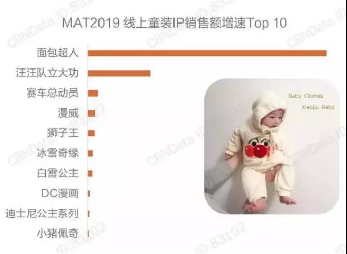 CBNData消费大数据,2019年童装IP销售额增速TOP10的几大IP形象如图,大部分童装IP出自美国。由此可以看出,国产动漫依然比较弱,在IP变现上也缺乏运作能力。