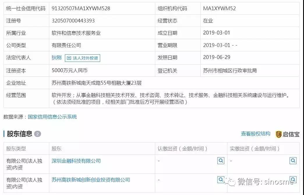 此外,央行还看中了苏州。通过深圳金融科技有限公司为控股公司,在苏州注册了“长三角金融科技有限公司”(见下图)。