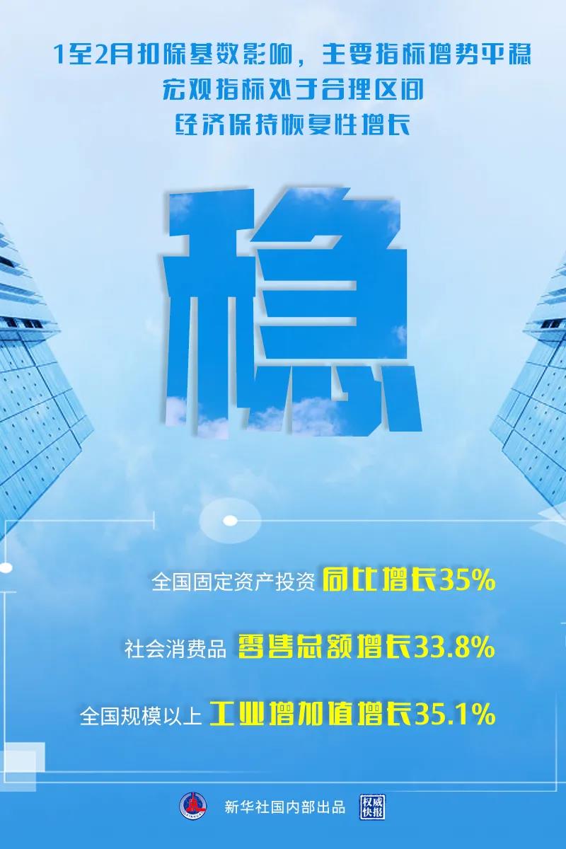 1-2月份,在以习近平同志为核心的党中央坚强领导下,各地区各部门统筹疫情防控和经济社会发展成效持续显现,工业和出口较快增长,投资和消费稳步恢复,就业和物价总体稳定,基本民生保障有力,国民经济持续稳定恢复。从同比数据看,受2020年同期基数较低等因素影响,主要指标同比增速较高,扣除基数影响,主要指标增势平稳,宏观指标处于合理区间。