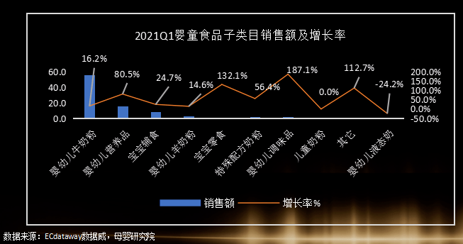 在本次天猫母婴亲子婴童食品专场母婴行业观察的分享中,一组数据显示,2021年Q1聚焦母婴线上消费,婴童食品持续领衔品类增长,与去年同期相比增长率达28.3%,营养品、宝宝零食、特配粉等子品类持续爆发,细分赛道增量机会凸显。