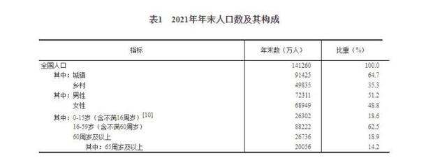 中新财经2月28日电 2月28日,国家统计局发布《2021年国民经济和社会发展统计公报》。年末全国人口141260万人,比上年末增加48万人,其中城镇常住人口91425万人。全年出生人口1062万人,出生率为7.52‰;死亡人口1014万人,死亡率为7.18‰;自然增长率为0.34‰。全国人户分离的人口5.04亿人,其中流动人口3.85亿人。(完)