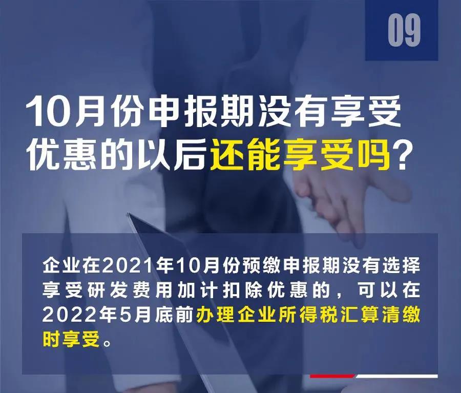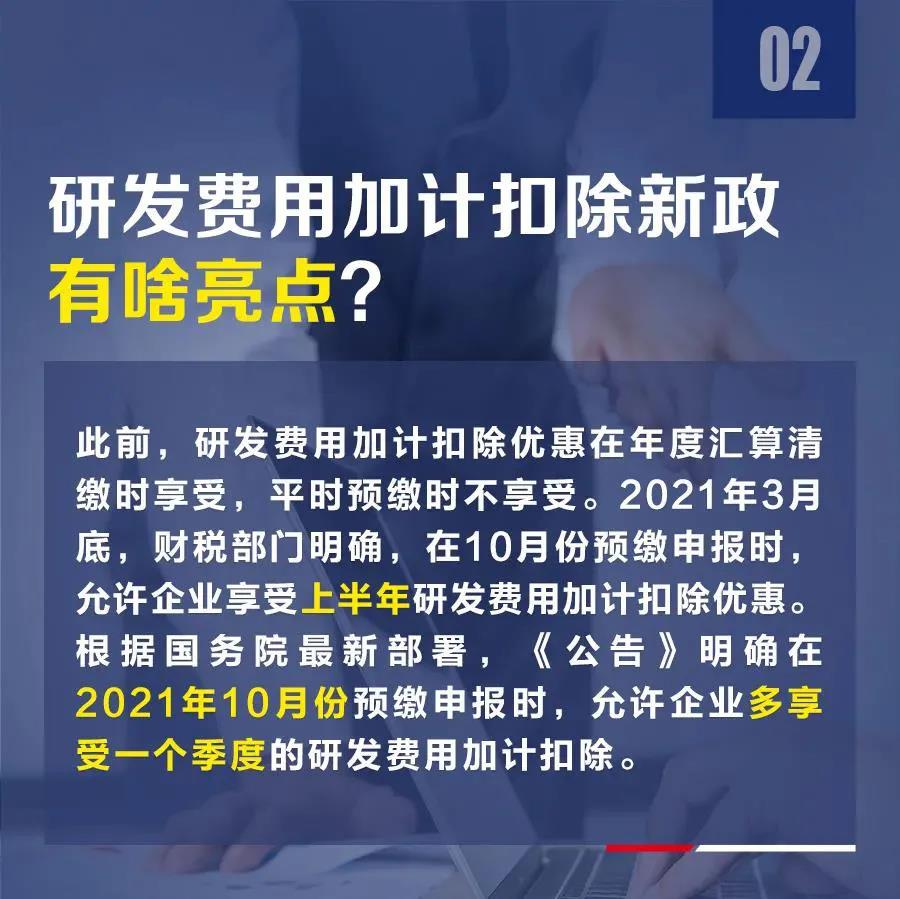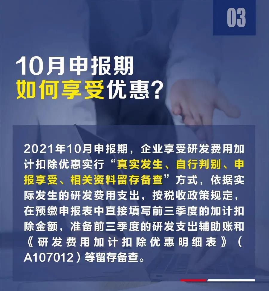 为进一步提升企业研发积极性,激发企业创新活力,国家税务总局日前发布《关于进一步落实研发费用加计扣除政策有关问题的公告》(以下简称《公告》)明确,2021年10月份纳税申报期,在允许企业享受上半年研发费用加计扣除的基础上,将再增加一个季度的优惠。