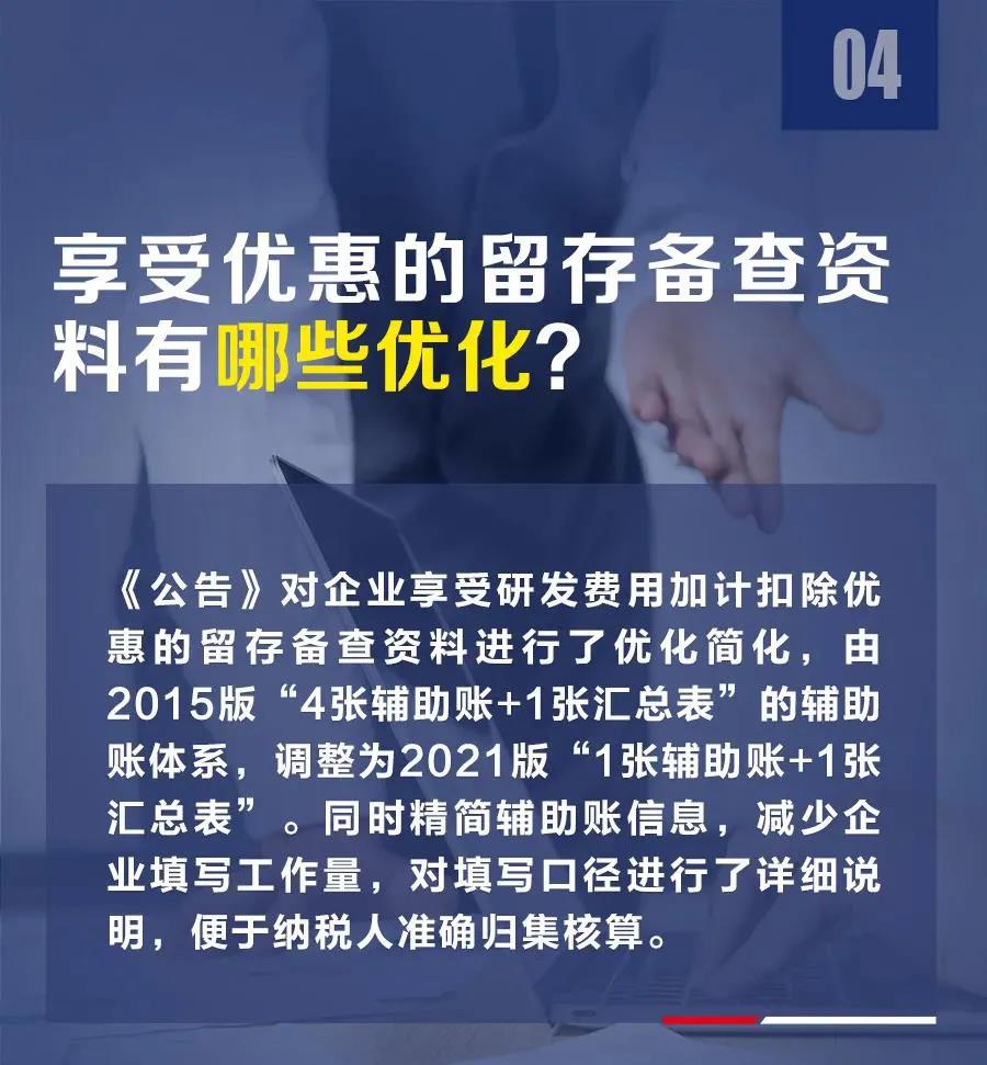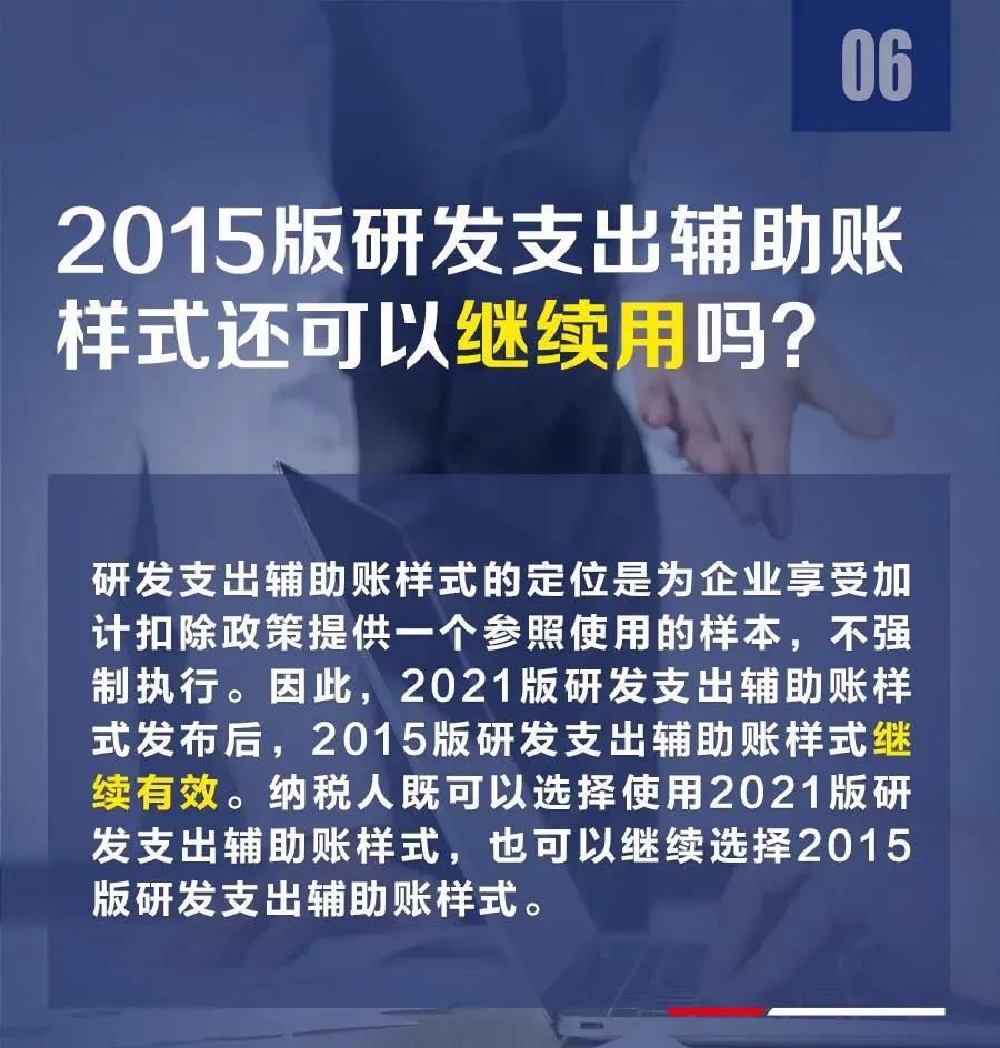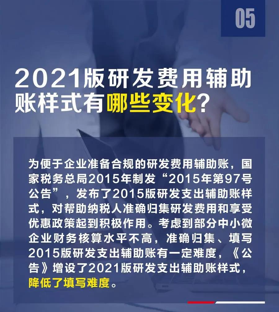 为便于企业准备合规的研发费用辅助账,税务总局2015年制发《关于企业研究开发费用税前加计扣除政策有关问题的公告》(2015年第97号,以下简称97号公告),发布了2015版研发支出辅助账样式,对帮助纳税人准确归集研发费用和享受优惠政策起到积极作用。考虑到部分中小微企业财务核算水平不高,准确归集、填写2015版研发支出辅助账有一定难度,《公告》增设了2021版研发支出辅助账样式,降低了填写难度。