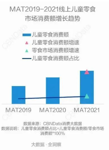 在《2021儿童零食消费洞察报告》中显示,近三年来,线上儿童零食的市场占有率持续提升,品牌数量、消费额、消费人数持续走高,实现供给、消费双向增长。