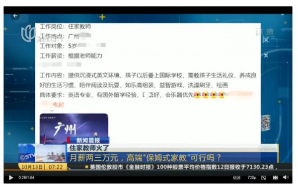 记者就一月薪标注为3万元的岗位,向家政公司咨询应聘条件,对方表示需要本科以上学历、英语六级、有教师资格证、能用英文辅导小学全科、有海外留学经历且年龄在40岁以下。在上海地区,有资历的老师可以开价到3万元甚至更高。