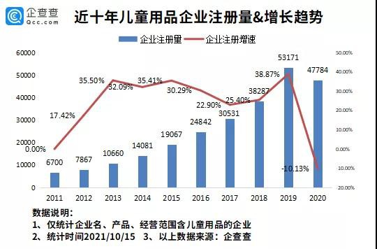 企查查数据显示,我国现存儿童用品相关企业29.65万家。2019年我国新增儿童用品相关企业5.32万家,同比增长38.87%,是近十年新增儿童用品企业最多的一年,也是增速最快的一年。2020年我国新增儿童用品相关企业4.78万家,同比下降10.13%。总体来说,近十年,我国儿童用品相关企业注册量逐年上升,增速较快。