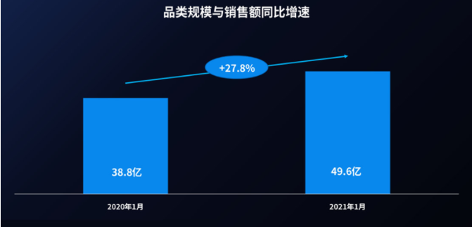2021年1月,童装童鞋类目,天猫销售额达49.6亿元,较2020年1 月销售额38.8亿元,同比增长27.8%。