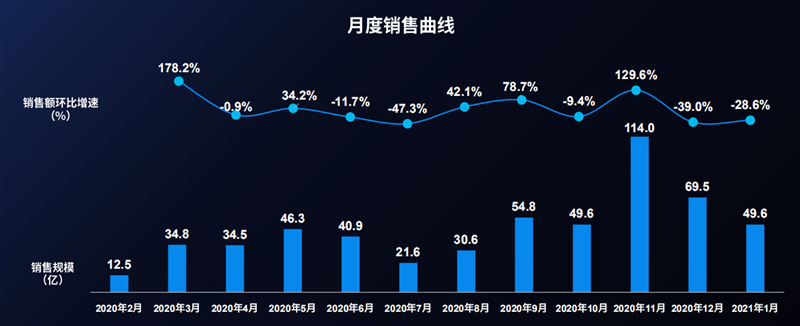 从月度销售曲线来看,受每年双十一电商节活动的影响,一年中的交易高峰在11月前后,2020年十一迎来销售高峰,销售额高达114亿元,销售额环比增长129.6%。