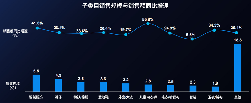 2021年1月,对羽绒服、裤子、棉袄/棉服、运动鞋、外套/大衣、儿童内衣裤、毛衣/针织衫、套装、卫衣/绒衫等进行分析,除其他类子类目,羽绒服饰销售额达6.5亿元,市场规模较大;儿童内衣裤销售额2.8亿元,同比增速较快,达55.8%,可见儿童内衣裤有着巨大的市场。