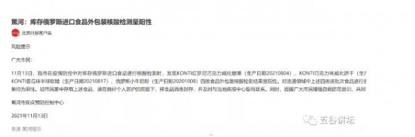进口食品的安全检测一直都备受关注,在11月13日的时候,黑龙江省黑河市疾病预防控制中心发布消息,在疫情防控中对库存俄罗斯进口食品进行核酸检测时,发现俄罗斯小牛奶粉(生产日期20201008)、KONTI红罗尼巧克力威化糖果(生产日期20210804)、KONTI巧克力味威化饼干(生产日期20210804)、KONTI香瓜味半球软糖(生产日期20210817)四类食品外包装核酸检测结果呈阳性。对流通领域中上述四类该批次食品进行多点采样,核酸检测结果均为阴性。