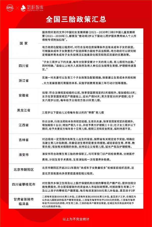 为了方便大家清楚看到此轮各省份公布的修订计生条例,笔者不完全汇总了全国三胎政策情况,主要聚焦住房、教育、医疗、生养等几大方面,比如中央明确:地方政府在配租公租房时,对符合当地住房保障条件且有未成年子女的家庭,可根据未成年子女数量在户型选择等方面给予适当照顾;推动将3岁以下婴幼儿照护服务费用纳入个人所得税专项附加扣除等。