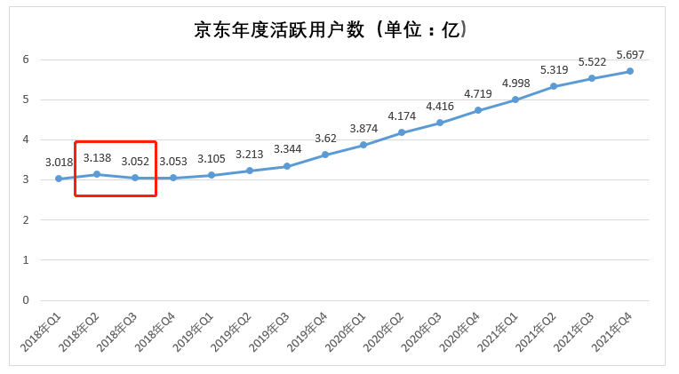 另外一个出人意料的数据是,京东2021年的年度活跃用户数增长至5.697亿。
