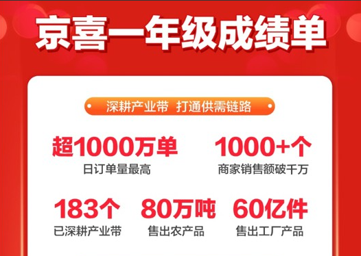 在当时,京喜的日订单量最高超过1000万单,平台内超过1000个商家的销售额突破千万。同时,京喜售出的农产品多达80万吨,工厂产品多达60亿件。
