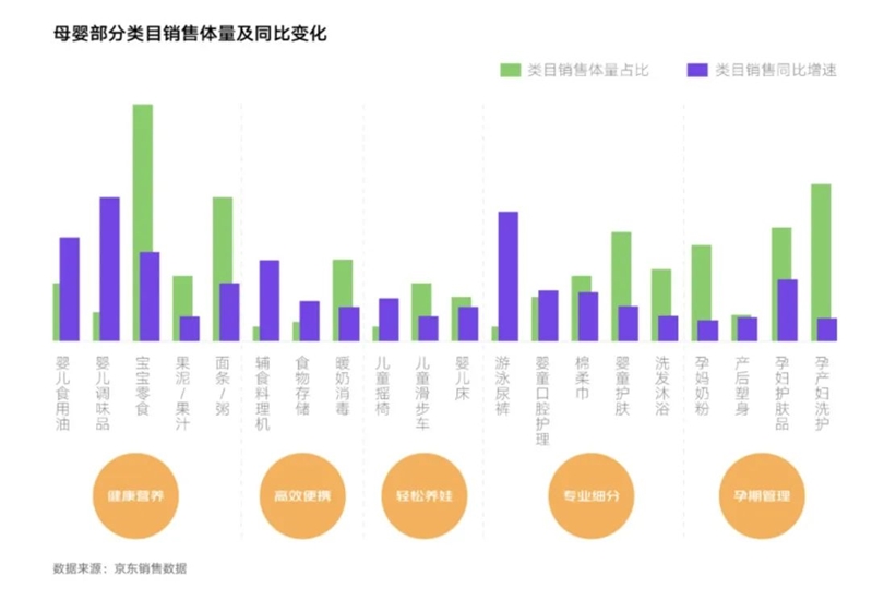 据京东日前发布的《2022京东618消费新趋势报告》显示,基于近半年的趋势现象总结出,母婴行业“精心孕育”趋势凸显,家庭精细化孕育的概念逐步深入,婴童养育及孕期管理的需求不断细分。同时,根据京东的销售数据,通过对比销售体量和销售增速两个维度,发现有一些细分类目成交贡献提升明显,也有不少细分品类迎来高增长态势。