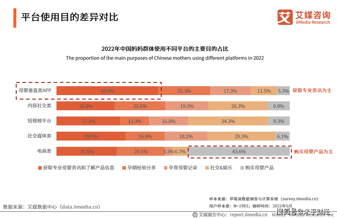 数据显示,新生代妈妈群体使用母婴垂直平台的主要目的中,为了获取专业资讯和产品信息的比例为43.6%;使用内容社交类APP、短视频平台以及社交媒体类APP的主要目的均为社交&娱乐。艾媒咨询分析师认为,妈妈群体使用不同平台的主要目的差异明显,母婴垂直平台以系统化的母婴服务及专业的母婴资讯吸引用户使用,电商平台以购买母婴产品为主。