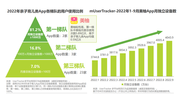 其中美柚月度总使用次数为5.89亿次,远高于亲子育儿类App的均值0.59亿次。近年来,随着美柚品牌影响力的不断提升,其整体用户也获得了持续稳定的增长。mUserTracker数据显示,截至2022年9月,美柚App月独立设备数达到4043.9万。美柚App活跃用户数占母婴亲子类App的53.7%,其用户行为数据可作为了解孕产人群画像和诉求的重要窗口。