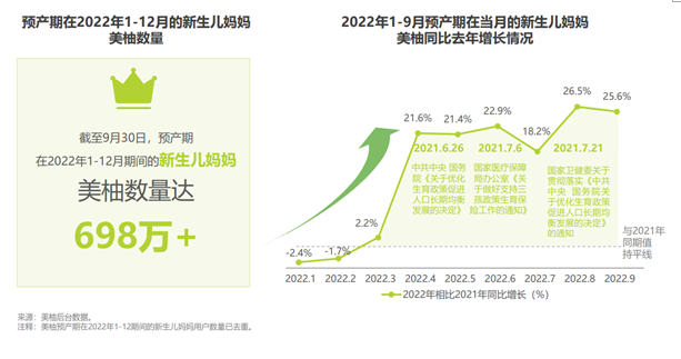 艾瑞以整体育龄女性(20-45周岁)及2022年新生儿妈妈为对象进行调研,发现截止2022年9月,在美柚上填写预产期在2022年1-12月的新生儿妈妈数量超过698万,同比大幅增长。其中,预产期在2022年二季度的孕产人群数同比增幅高达21%以上。