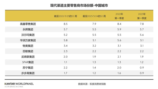 现代渠道市场集中度下降的趋势更加明显,呈现进一步的碎片化的发展。排名前十位零售商的总体份额在一季度从去年同期的37.7%降至34.5%。其中苏宁集团、步步高集团、永辉集团下降趋势较为明显,而有“中国便利超市第一股”之称的红旗连锁表现亮眼,在现代渠道中份额有所提升,继去年实现营收和净利润双增长之后,在2023年第一季度营收同比增长4.7%。