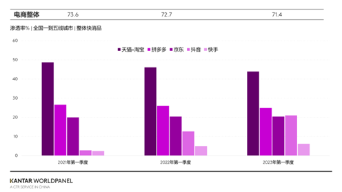 2022年兴趣电商的崛起和即时零售的发展对于传统电商形成较为明显的挤压,一季度阿里巴巴、京东和拼多多渗透率较去年同期有所下滑,在疫情管控放开后降速放缓,消费者的购买频次明显回升。而兴趣电商中,抖音和快手在一季度保持高速增长。尽管客单价有小幅下降,但渗透率和购买频次依然优异表现。一季度,超20%的中国城市家庭在抖音平台上购买过快消品。