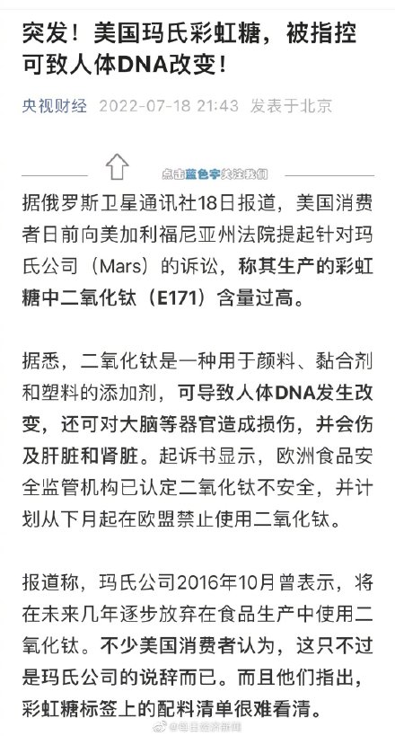 据俄罗斯卫星通讯社18日报道,美国消费者日前向美加利福尼亚州法院提起针对玛氏公司(Mars)的诉讼,称其生产的彩虹糖中二氧化钛(E171)含量过高。据悉,二氧化钛是一种用于颜料、黏合剂和塑料的添加剂,......